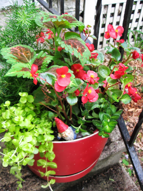 This container includes: Coleus, Scarlet Begonia, Asparagus Fern, Variegated Vinca. I don't know the name of the bright green trailing plant. I wanted a sweet potato vine but none were to be had at the garden center. I'm sure they are available at the farmer's market but I was too lazy to trek downtown. All of these plants are supposed to grow well in partial sun so I hope they work out. There is a big maple in the front yard so these containers get filtered sunlight.